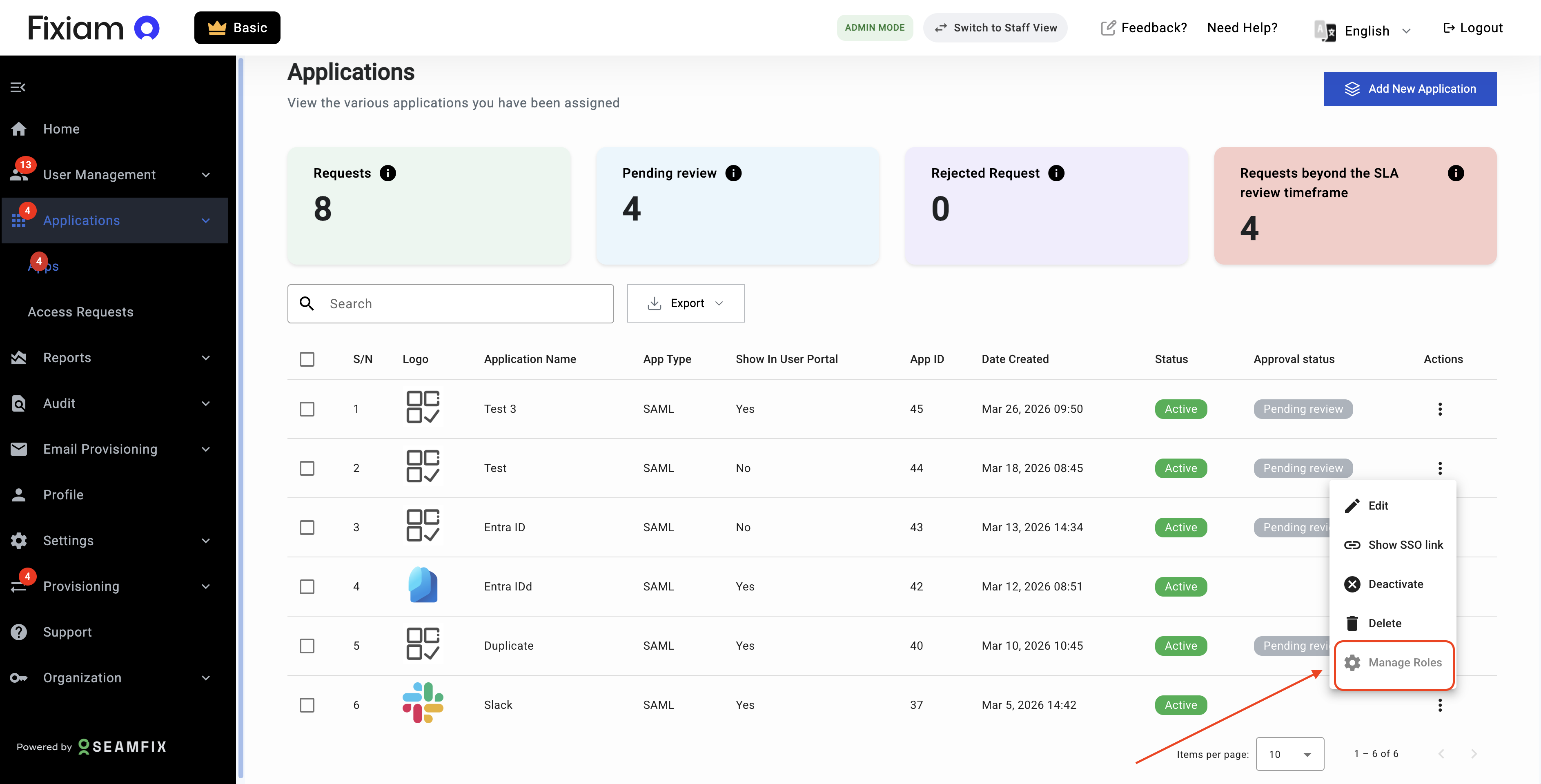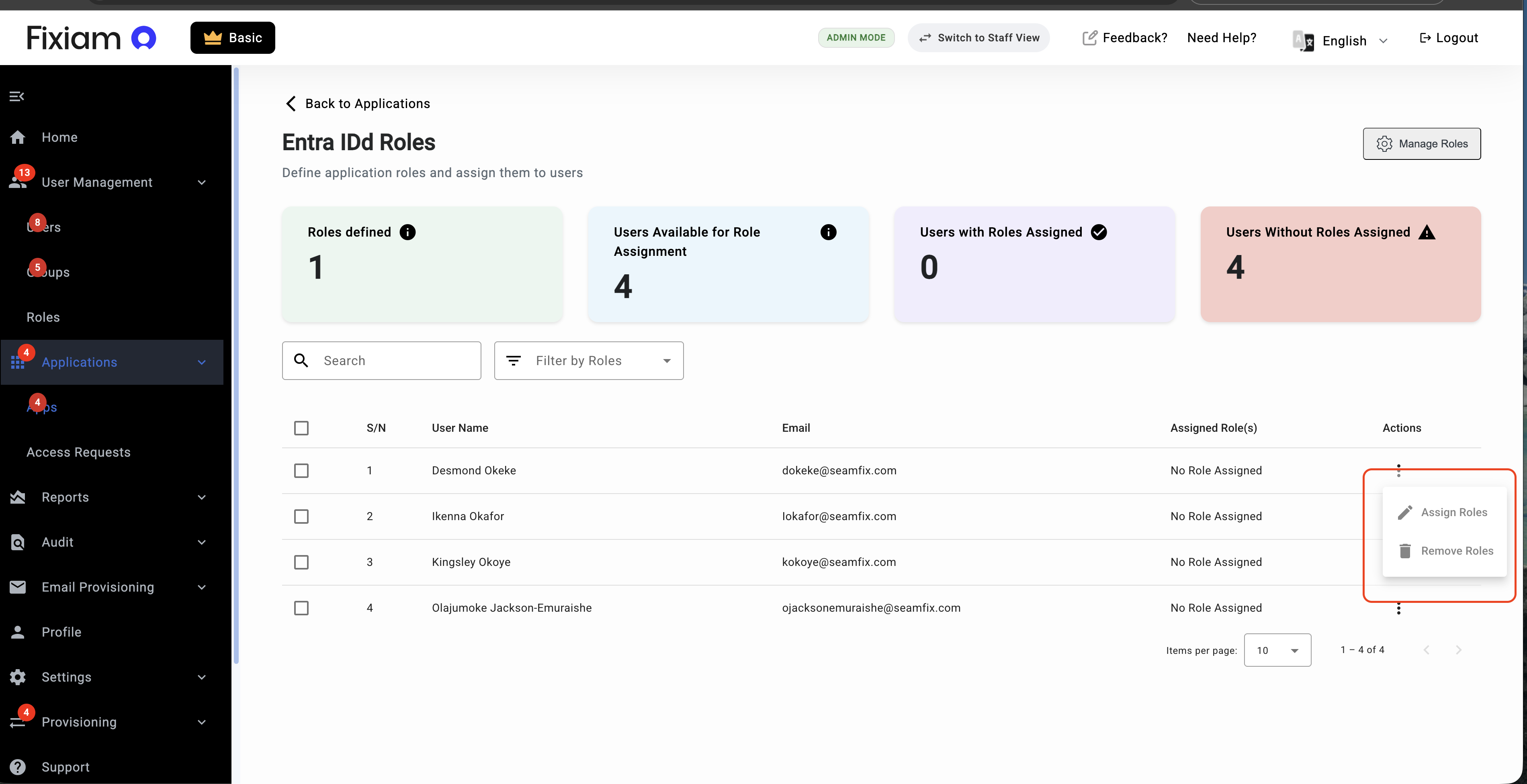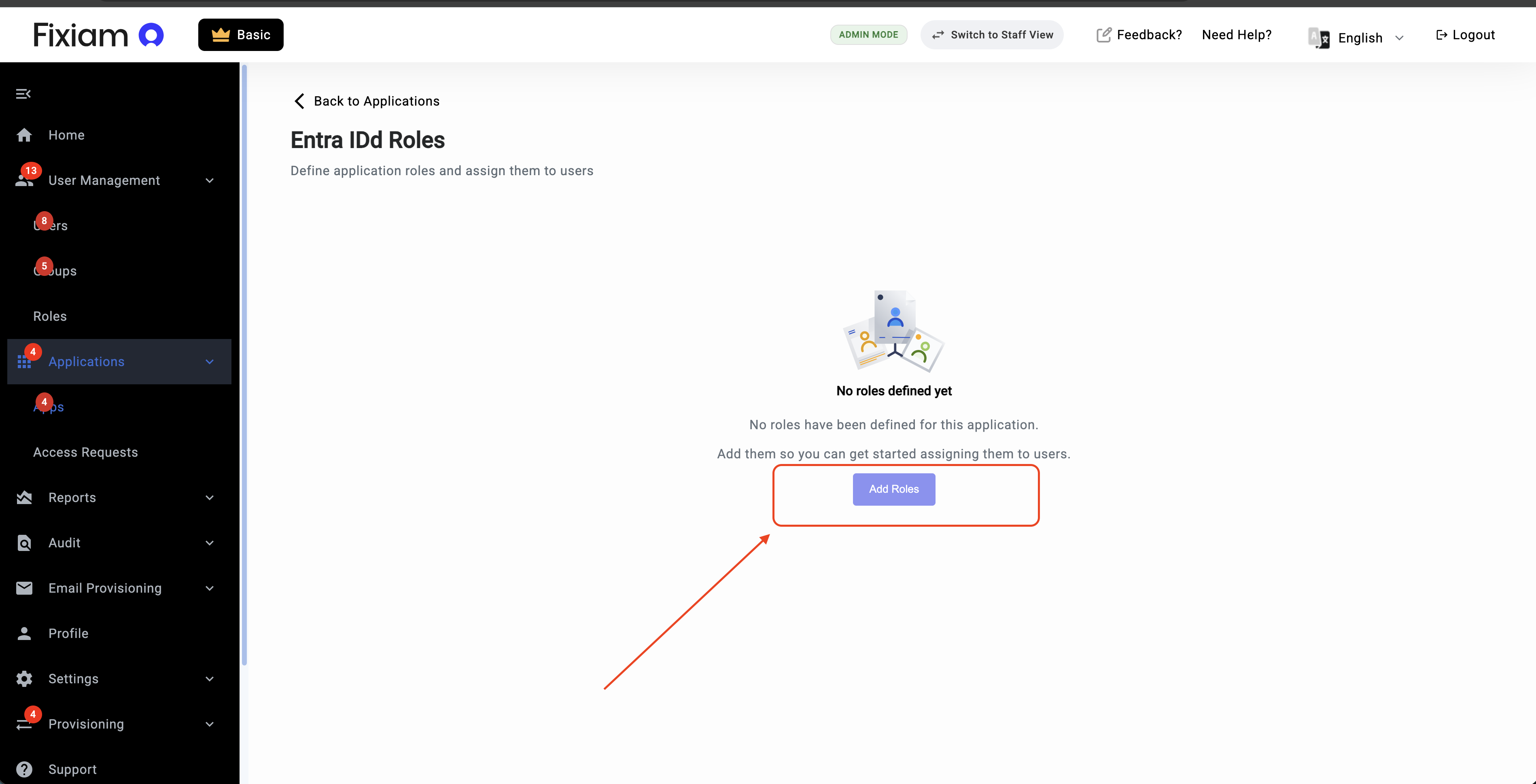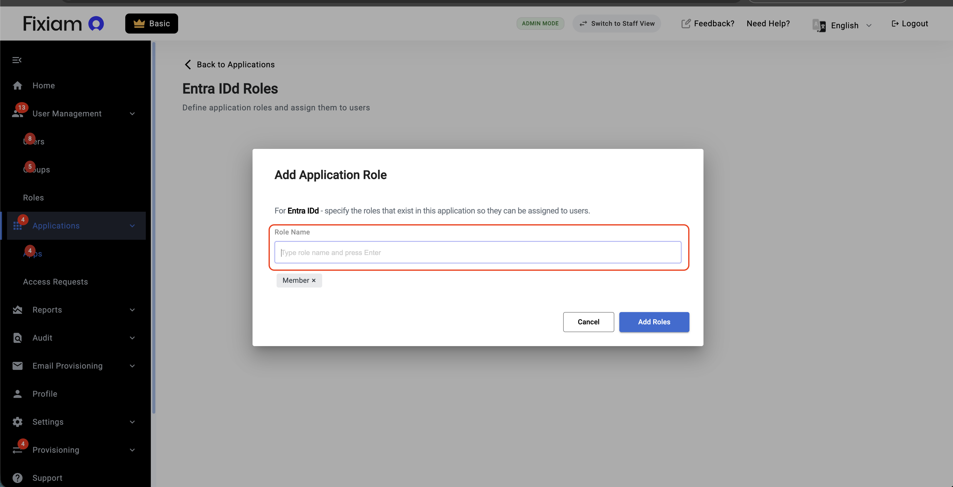 Once an application is connected to Fixiam, you can define roles (for example: Admin, Viewer, Manager) and assign them to users. These roles are then passed to the application during login.